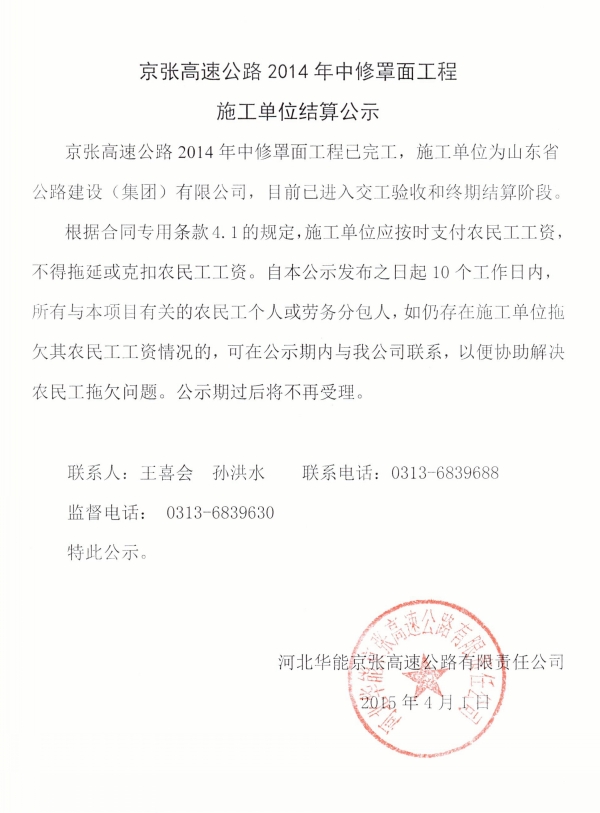 京張高速公路2014年中修罩面工程施工單位結(jié)算公示