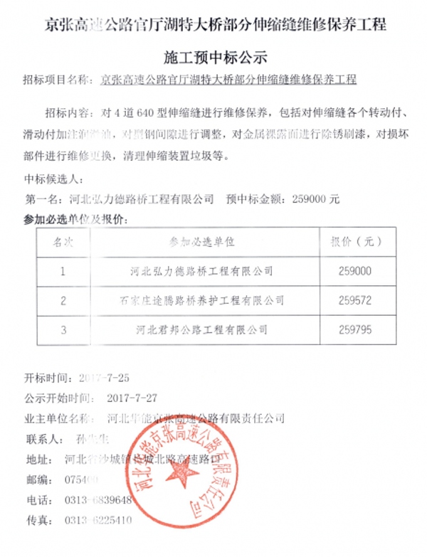 京張高速公路官廳湖特大橋部分伸縮縫維修保養(yǎng)工程施工預(yù)中標(biāo)公示